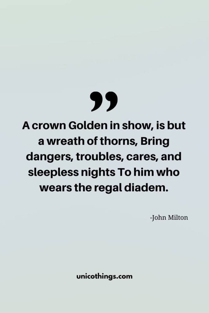 24. “A crown Golden in show, is but a wreath of thorns, Bring dangers, troubles, cares, and sleepless nights To him who wears the regal diadem.” – John Milton